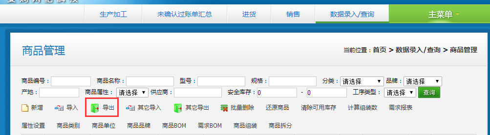 第一步:點擊“數(shù)據(jù)錄入/查詢”模塊,然后在右側(cè)子常用功能下面找到“商品管理”,選擇此菜單,如圖: