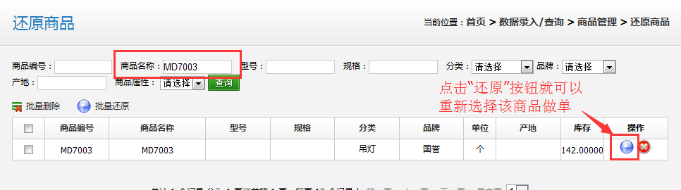 查詢”還原商品“該商品出現(xiàn)在列表里: