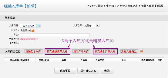 “精確入庫”的意思是:組裝入庫的時(shí)候,可以精確的根據(jù)某一張訂單來入庫,可以統(tǒng)計(jì)得到已入庫數(shù)和剩余入庫數(shù),該訂單全部入庫完后則會(huì)消失在選擇列表里面,這樣就避免了重復(fù)入庫,造成實(shí)際庫存和系統(tǒng)庫存的誤差。